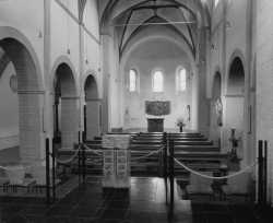 Kirche, die bereits 1135 erwähnt wurde. An das Mittelschiff und die beiden Seitenschiffe schließt sich nach links das quadratische "Westwerk" an, das den Kirchenraum entsprechend verlängert.
