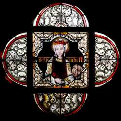 werden gegen drei von ihm selbst entworfene Fenster mit Heiligendarstellungen ersetzt, die in ihren Abmessungen etwas kleiner gehalten sind. |