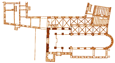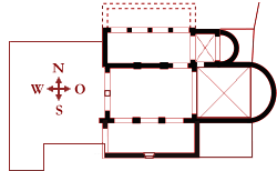 Klar zu erkennen ist das nach Osten (rechts) ausgerichtete Mittelschiff mit der halbrunden Apsis. An das Mittelschiff schmiegen sich die beiden Seitenschiffe an: unten das südliche (es hat