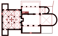 Daran angesetzt erkennt man ganz unten (Süden) den quadratischen Querschnitt des Kirchturms. Innerhalb des Westwerks sind ringsherum die 3 Emporen zu sehen: unten die kleine Südempore, die als